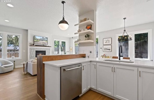 this two bedroom family home is right in the middle of lake oswego in a very quiet neighborhood 3 blocks to George Rogers Park and New Seasons market. One block to Freepons park. All bedroom furniture is brand new featuring 2 king beds. You will love the gathering spaces in the home, watching TV in the warmth of the gas fireplace. Brand new outdoor covered patio. Restoration Hardware decorations, 3 new TV's, amazing kitchen and dining room.