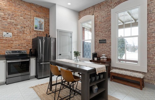our building was built at the turn of the 20th century The 2nd floor walk-up apartment features a full renovation in 2022/2023. We removed the 120-year plaster cast to expose the original brick walls giving the space a NY loft feel with the brick representing the history of a time gone by. The apt. boasts 12' walls and 7.5' windows. You'll have a great view of the downtown center of Millersburg. Additionally, you’ll find upward of 50 modern amenities including a full kitchen, large shower, soaking tub, 2 cozy bedrooms with queen beds, and a large living space that includes a 65” television, electric fireplace, beautiful drapery and comfortable seating for lounging. I’ve added my own special touches through art, décor and seasonal décor setting us apart. One feature guests love is our Greenery wall located just inside the back door. It’s a great place to take pictures, and capture memories. Outside, you’ll find a FREE parking spot for 1 car and a covered deck to relax when weather permits.