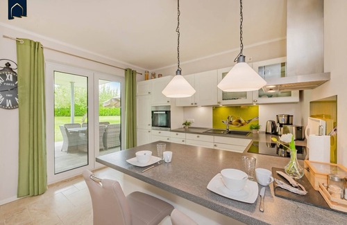 three spacious bedrooms are furnished with double beds, one of which has an additional bunk bed The house is ideal for families with children. The fully equipped open kitchen is equipped with all utensils and meets the highest standards. In the adjoining living room with fireplace and adjoining dining area for 8 people, floor-to-ceiling window elements provide plenty of light. You get to the large terrace with barbecue and garden. Two bright bathrooms furnished with modern floor-level showers leave nothing to be desired.