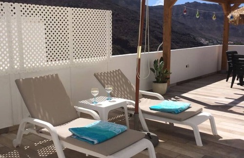A modern, bright, penthouse apartment in the magnificent valley of Mogan. Many guests love the huge private roof terrace complete with jacuzzi, (JACUZZI is an OPTIONAL extra for 7 day stays or more only) loungers, parasol and BBQ. Many guests chill here all week as its so relaxing. yoga enthusiasts love it due to the vast space! free wifi and and smart tv
