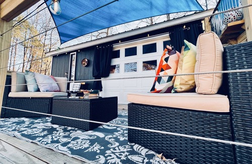 Vibrant Cabin is an open concept tiny home filled with accents like shiplap walls, metal ceilings, custom tile and artwork. We have a fun wood and metal bathroom, wood plank flooring and even a garage door opener! You’ll find a queen bed with luxurious pillows and bedding. Relax and soak in our freestanding tub surrounded by eclectic art and fun lighting options. Speaking of which… you can dim your overhead lights and change the room color at an point, thus changing the mood of the space instantly! You’ll have a record player, classic LP’s (70's and 80's for days), a Bose Soundlink Speaker and a medium size wine fridge (big enough for to-go boxes 😉) This inviting space has a garage door that opens to a beautiful deck overlooking the Calf Killer River…here you’ll find your living room space! You’ll be surrounded by warm lighting in and around the trees. You’ll find hammocks, swings, roses and wildflowers in the spring and summer.. A fire pit with cooktop for grilling, and the absolute best space in the area for some night sky viewing. You can easily walk into Sparta for dinner, drinks or a day of shopping! Two guests only please. It’s a space devoted to absolute relaxation. Reminder that we do not have Wi-Fi at this property but cell service is good so plan accordingly..