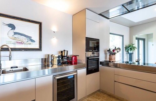between the provinces of pisa and siena, in the crisp air of the hills, within the tegoni farm estate is villa airone, immersed in a green vortex of dense vegetation that surrounds it in a fragrant embrace of perfume The villa was built in modern key in 2015, initially conceived as a Club House for the riders of the stables to relax in; it has a framework made entirely of laminated wood, walls in ecological material, insulation in goat-wool panels covered with Siberian larch wood that guarantee the best thermal insulation. It has just one floor, creating contemporary and functional environments with the aim of capturing the wonders of the place in which it lies through large windows. At the front, a natural pond formed by rainwater communicates an energy and a particular charm at all hours of the day and in all seasons. The terrace in front of the villa, the vital centre of the property, is set up with tables and chairs where guests can enjoy the open air in total relaxation while nearby, in a more secluded position, is a heated swimming pool with salt purification, solarium and counter-current swimming. The park surrounding the residence, mainly lawned and dotted with tall leafy trees, extends into the 30-hectare farm which includes an organic olive grove and a free-range piggery of the prized Cinta Senese pigs, stables, due to the owners' great passion for horses, and a large indoor riding school. The main entrance leads into an open-plan area where your attention will be caught by the modern kitchen, an extension of the living and dining room and a tasting room where you can take part in cooking classes, culinary demonstrations and wine-food pairing courses.