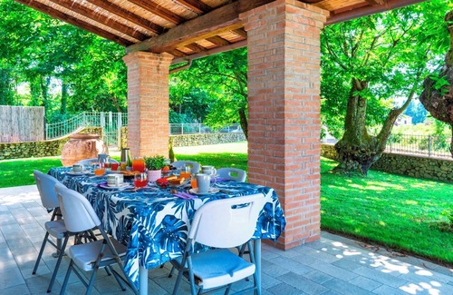 the villa is surrounded by a level garden with fenced lawn of about 500 sq m and with chestnut trees planted here and there to create privacy and natural shady areas In the front area of the villa is the brick-built portico with a nice dining area, connected directly to the two rooms of the main living area: the kitchen and the living room.Please notice that photos are taken in spring, therefore flower blossoming, and the colours of the gardens' grass could be different at the moment of your arrival at the villa.
