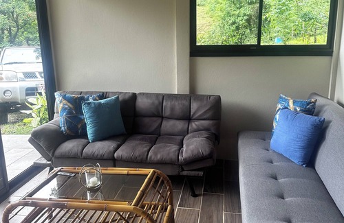 This enchanting villa in the mountains of Parrita offers a cozy retreat for guests. With 2 bedrooms including a queen bed in one bedroom and two twin xl beds in second bedroom, plus a living room with a 2 sofa beds (futons) there's plenty of space to relax. Stay connected with WiFi and enjoy the pleasant surroundings of this charming property. It's easy to see why you'll be able to unwind at our place. We are located 45 minutes off the main road into the mountains. Some of the road is rough with many pot holes. While we can be accessed by car, an suv or 4x4 is recommended. We are located in a very remote area and our property is perfect for nature loving adventurers..