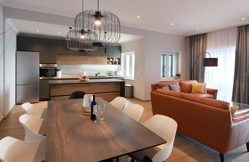This amazing property has 170m2. It is located on a beautiful seaside (district Pecine) on the 2nd floor. It has 3 spacious bedrooms, 3 bathrooms + one additional toilet, kitchen, dining room and living room. Each bedroom has different theme, each cosy, beautifully furnished. The terrace overlooking Kvarner bay and Kvarner islands is breathtaking. This luxurious property offers the opportunity to enjoy your holiday on a beautiful coast and enjoy the sea scent and sea sounds from every room..