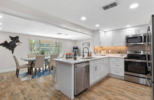 Welcome to your perfect coastal retreat in a waterfront home! This 4-bedroom, 2-bathroom home is designed for comfort and relaxation, offering a unique blend of modern amenities and serene waterfront living, walking to the local beach, and restaurants, this property is ideal for families, boating enthusiasts, and anyone looking to enjoy the best of Florida living. A coastal living paradise with all the amenities you would want for a perfect vacation with friends and family visiting Florida.
