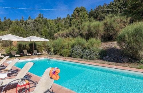 next to the holiday villa in tuscany is a private swimming pool with umbrella and deck chairs, surrounded by a green area equipped with table, chairs and barbecue