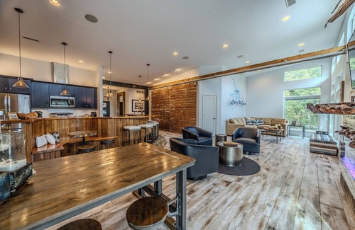 voted the #1 vacation home in missouri by usa today, this 8-bedroom, 9-bathroom retreat sits right on lake of the ozarks’ 7mm Enjoy direct lake access with two private boat slips, a swim dock, and two expansive patios with fireplaces perfect for cool evenings. The home is ideal for large groups, offering a wet bar with multiple TVs for game day, two kitchens, and a rustic coffee bar.