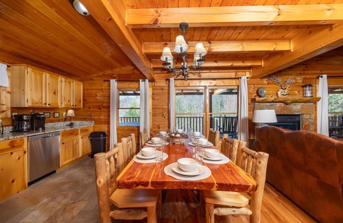 great cabin for your family vacation! the main level is handicap accessible with a handicap accessible bedroom with a king bed and bathroom with grab bars and a roll-in shower There is another bedroom on the main level with a king bed, and full bathroom. The kitchen is fully equipped and there is a large dining room table. The living room has a gas fireplace, and flat screen TV. The master bedroom upstairs has a king bed, private balcony, large bathroom with Jacuzzi Tub. The open loft has the pool table, arcade game, bunk beds, and full bathroom. The private back deck has a hot tub, rocking chairs, and gas grill. Dogs are allowed for a pet fee of $119 per dog.