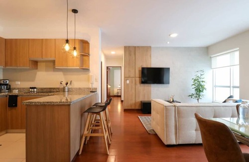 enjoy the comfortable features of a hotel quality apartment in the heart of miraflores; stay walking distance away from iconic sights like kennedy park, san ramón food market, lovers park, larcomar and the malecon