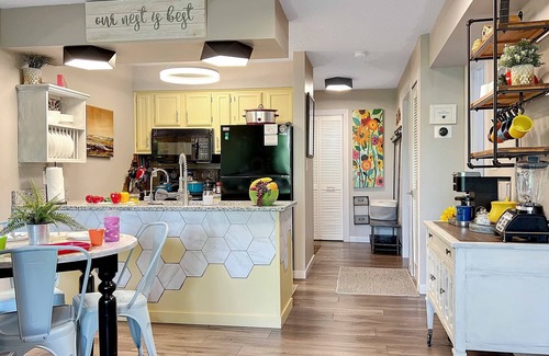 inside the nest, we've meticulously curated every corner with adorable honey-bee décor and charming touches guaranteed to delight Our nest comfortably accommodates families with a fully stocked kitchen and two full baths. You'll find everything from pots and pans to dishes, making meals together easy as honey pie. And don't worry—the kids have plenty of games to stay entertained, plus there's a pack-and-play and high available for the littlest bees. You MUST reserve them when you make your reservation as they are first come first served.