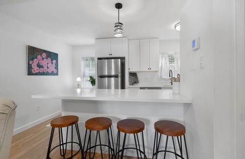 the sleek, modern kitchen features stainless steel appliances, spacious white countertops, and all the essentials to prepare meals at home Enjoy casual dining at the breakfast bar with seating for four or sip your morning coffee by the window-lit reading shelf.