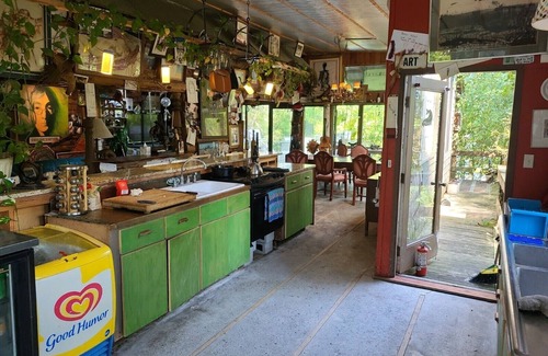 Walker world is more of an experience then just a stay, with more than 10 acres of art sculpture Orchard Barnes piano Shacks and Black River it is a constant source of awe and entertainment to old friends and newcomers not for the faint of heart come and enjoy the magic and philosophical freedom that the idea of Art embodies. The main house has a 60 ft wooden rowing skull piercing each end hanging outside 15 ft and 8-man rolling skull upside down with little leather shoes and shoe strings hanging down with wine bottles filling the voids of each end of the house that fill up with light during the day a 30 ft tall Agave flower inside the main Salon artwork everywhere wrought iron stairwell brass beds radiant floors windows and trees balconies porches fire pits pontoon boats patios fireplaces flowers Old Mercedes it's all here somewhere..