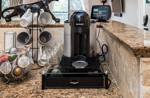 fully stocked kitchen with wine cooler, pots and pans, tea kettle, microwave, countertop toaster oven, glasses, dishes, knives, coffee cups, silverware, dishwasher, icemaker, blender and everything you need to feel right at home Sleep Number California king mattress in the master and queen mattress in the guest room both with plush pillow top comforter.