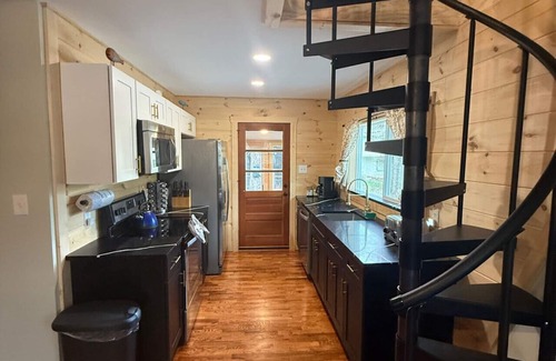Inside, guests will find a fully equipped Stainless Steel kitchen with Quartz counters ready for any type of cooking. The refrigerator has filtered drinking water and ice. A dishwasher is also on premice for easy cleanup. The living room adjacent to the kitchen includes a 50" smart TV, Classic NES & PS1. Upstairs there a cabinet with pleanty of board games to use. In the corner is a spacious leather sectional and under the TV is a beautiful white cast iron gas fireplace that turns on to keep you cozy with the flip of a switch. We leave custom getaway guides on the coffee table that includes information on the property and the local area with our personal recommendations. There is a mini-split for heat and ac located in the living room.
