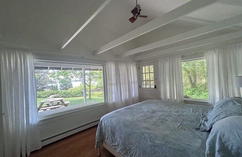 Charming one level home situated on a private and serene beachfront lot in Wareham. Gorgeous ocean views from every room in this mid-Century 3 bedroom 1 bath home. Set back off a private road this home shares a private beach with just one neighbor. Abundant windows and cathedral ceilings fill the open living space with tons of sunlight. Fully equipped kitchen as well as washer and dryer. Enjoy ocean views and breezes from all three bedrooms. A patio, grill and large flat backyard welcome outdoor activities and dining. Stroll from the shady backyard right to your private beach! Conveniently located near Wareham Village and Onset with the Cape Cod Canal, restaurants and tourist attractions nearby.