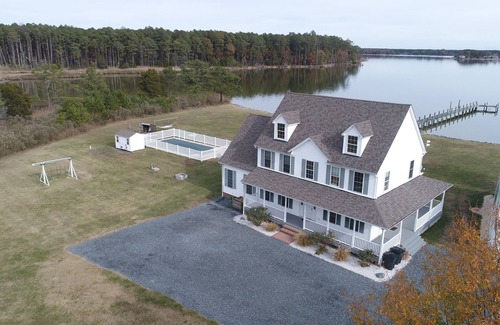 The Spinnaker at Swan Cove has a great location on 6 private waterfront acres and awaits your next family vacation or getaway. It features incredible waterfront views with a fenced swimming pool, 4 kayaks, a private dock for fishing, crabbing and boating, outdoor fire pit with wood, playground area. This lovely home features a first floor spacious master suite with a sofa bed and a private door leading to outside living space.Second floor features 3 bedrooms with shared bathroom and 4th upstairs bedroom has an on suite. The first floor has a beautiful kitchen and dining area overlooking the water. The oversized living area/den with a queen sofa bed , 48" TV,DVD and Xbox 360. The waterviews are spectacular. Te door from deck overlooking the water has direct access from the kitchen. Laundry room is located on the first floor. all bedrooms have directv & wifi (not for streaming)