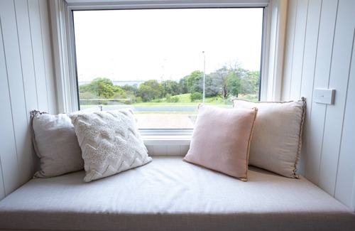 the main bedroom features a plush queen size bed adorned with the softest linen and a charming window seat perfect for watching the incredible sunsets The second bedroom, our cozy bunk room, boasts a double bed with a single overhead and a functional desk space that provides water views for those who need to work during their stay.