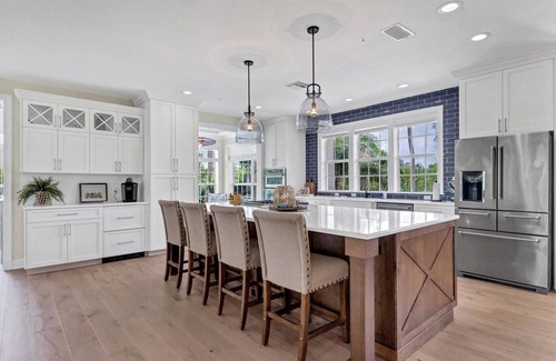 the open-concept floor plan and meticulous attention to detail set the tone for a refined coastal escape Elegant living and dining areas flow seamlessly to the outdoors, where large windows frame views of the pool terrace and lush greenery. The fully equipped kitchen is appointed with high-end appliances, a spacious island, and ample storage—perfect for preparing meals to enjoy at the dining table overlooking the pool.