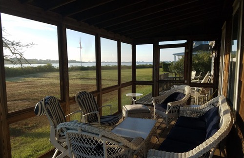 there is a dock for your shallow draft boat and a small private beach for your wind surfer or kayak on this three acre property There are crab nets and fishing poles and old bicycles and good books and cribbage boards and lovely neighbors and yes, dogs are more than welcome. The tennis court, which was built in 1876, beckons, “Come out and play.” Beautiful custom made stationary wooden benches under an oak tree overlook the three acre property. It is quiet and peaceful here.