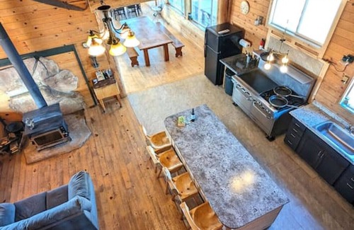 With two full bathrooms, 4 bedrooms, a loft area, two living rooms and two large viewing decks, this cabin is perfect for group your getaway. Specifications include a full chefs kitchen and large dining area, a cozy wood burning stove and fun fire man's pole to get from the loft to the kitchen. This cabin is situated near a our large event hall which can be used for various gatherings. All cabins are solar powered and completely off the grid. An excellent choice for eco-friendly travel..