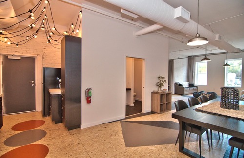 all 6 lofts combined can sleep up to 36 adults and offers modern design, with walk in multi jet showers, 6 full kitchens with concrete countertops and new appliances, 10' high ceilings, 4 queen beds, 2 king beds, 2 twin beds, 11 queen size sleeper sofas, dining table and chairs, tv, wifi, and completely furnished with luxury linens, towels, utensils and more Please know this is an open air loft. Bedroom and sleeping areas are separated only by curtains; therefore, there are no formal bedrooms.