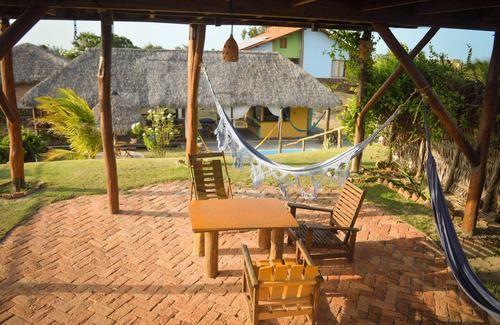 Bungalows of 40m², located on the beach of Macapá, built on a hill with an exceptional view of the coast, all rustic but very comfortable (air conditioning, hot shower, minibar, tv, internet, towels and bed linen included). Suite with queen bed and two single beds (all spring). balcony on two sides. Sitting area downstairs with table, chairs and hammocks, restaurant and pool plus breakfast included..