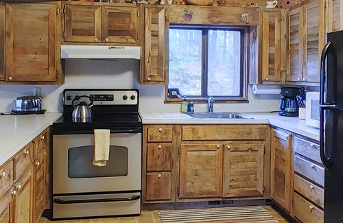 the living space is full of natural wood and comfortable furnishings, while the wood-burning stove adds an extra dose of warmth and character Scramble eggs on the stainless steel stovetop in the kitchen each morning, sip your coffee and read the paper on the screened-in back porch, and watch for passing wildlife in the surrounding meadows and woods. After a day spent out on the lake, you can toss your clothes in the washer/dryer and relax in front of the cable TV late into the evening.