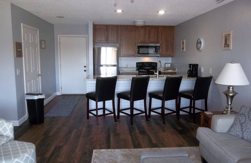 WELCOME to your home away from home at the Lake of the Ozarks! This is a GREAT newly remodeled two bedroom two bath condo with numerous amenities to offer and great view of the lake from the living room, master bedroom and balcony!! Upon entering the condo you are greeted with a spacious kitchen, living room and a wonderful view of the main channel. The kitchen is fully furnished with all new appliances, cupboards and granite counter tops. The cupboards are well stocked with all your needs for preparing meals. There is comfy bar stool seating for four inside. The spacious living room offers a queen size sleeper sofa (for young children only, no adults!!), ottomans, two chairs, new flat screen TV, and ceiling fan. New vinyl plank wood flooring through out the kitchen and living room adds to the beauty. With you in mind, all the furniture is new, and walls are freshly painted. No doubt your favorite place will be on the balcony overlooking the main channel, swimming pool and hot tub! Great for watching the kids at the pool during the day and watching the beautiful sunsets in the evening! There is a new patio set on the balcony with seating for six. Sorry, due to insurance, gas grills are no longer allowed on the condo balconies. (There are charcoal grills available for anyone's use on site.) The owners have been meticulous in making this a beautiful and comfortable condo for your vacation.