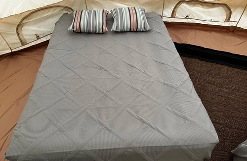 location: want to camp with a large group? no problem! the yokahu bell tent is a 300 square foot tent that can hold all of your needs Eight people can stay comfortably in our bell tent. We offer 4 air mattress inside, so all you need is yourself and a sleeping bag to lay atop. This campsite also has the space for two more people with their own sleeping Matt, and there is space for 2 extra camping tents for an additional fee, this must be scheduled ahead of time.