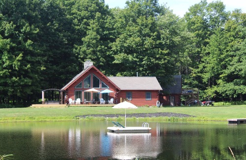 MINUTES FROM ELK MOUNTAIN SKI RESORT. 70 acre property with two exquisite homes. Private lake for your enjoyment! Large hot tub, Whirlpool tub, Game room, Flat screen TVs with Streaming & DVD, Wireless internet. LOTS to do outdoors - Ski at PA's best Elk Mountain, swim in the property’s natural spring fed lake, fish for bass in the lake and small pond (catch and release please) or fly-fish in the running creek, for keeps! Go hiking on the property’s beautiful land with its fresh running creek and discover hidden treasures (legend has it silver can be found in the creek bed!) as you make your way to the picturesque waterfall! Relax and enjoy the property’s full size hot tub, outdoor decks, canoe and row boat, paddle boat, paddle boards, rafts, outdoor fire pits, horseshoe pit, and in the winter enjoy cross-country skiing and the many sledding hills! Enjoy s’mores and watch shooting stars! When in season, you are welcome to pick fruit and vegetables from the organic garden and abundant fruit trees throughout the property. For indoor fun - rest and relax in front of the beautiful fieldstone fireplace and enjoy the Cathedral ceilings, cozy up in the loft and read one of the many books and magazines available to you, or watch a movie via streaming (Netflix/YouTube Stream) or DVDs for your browsing pleasure. If you choose you can also engage in a full suite of games on-site; Pool Table, Darts, Basketball, Foosball, Air Hockey, Xbox, ample board games and card games to suit everyone’s tastes! Main house has 3 bedrooms, full bath and full service kitchen and Carriage House has 1 bedroom, full bath and kitchenette plus a massage chair - perfect for families/friends travelling together but wanting their own personal space! Private 1/2 bath is located in the garage, ideal for use when enjoying the outdoor activities. Intercom installed for your chatting between houses..