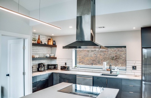 designed with distinctive modern architecture, this custom designed cabin contains 2 bedrooms, and 2 bathrooms (sleeps 6), with an open concept kitchen and living area The interior contains a minimalist style with stained concrete floors, quartz countertops and vaulted ceilings, all appointed with modern recessed lighting.
