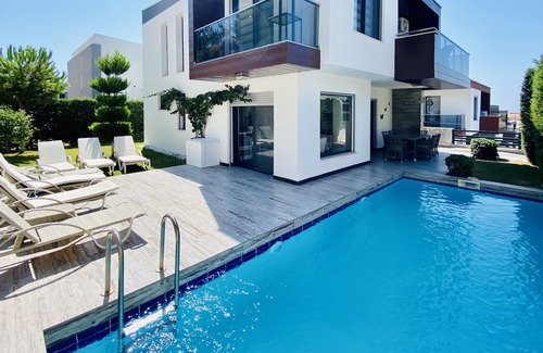 "Bahçeli, özel havuzlu muhteşem bir villada tatilin keyfini çıkartın! Büyük bir salon, 4 yatak odası, 2 banyosu 3 wc si olan muhteşem bir villadır. Giriş katında büyük bir teras, salon, mutfak, banyo&wc, misafir odası odası bulunmaktadır. Rahat oturma grubu, modern tasarlanmış odaları ve banyoları ile kalırken çok büyük bir keyif alacağınız bir villa sunuyoruz. 1 gün ara ile havuz temizliği yapılmaktadır.Denize 400-500 metre yürüme mesafesindedir.".